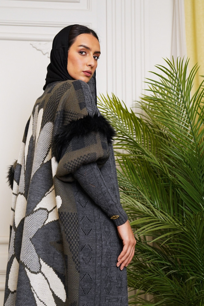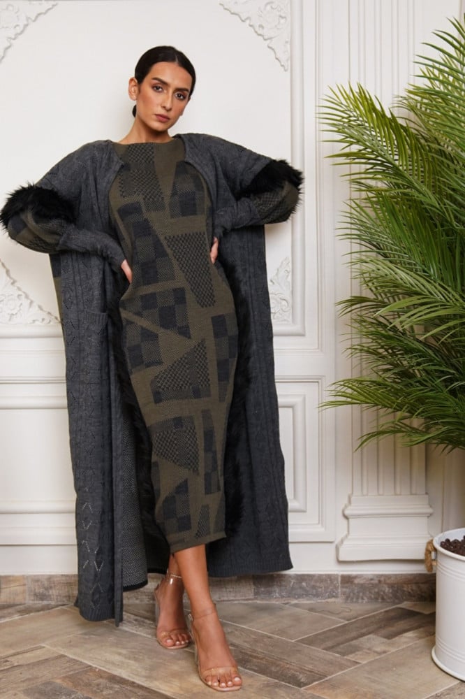 ( عباية زيتي مع فستان شتوية أكمام طويلة و بياقه دائرية وجيوب مع الطرحة مثالية لأوقات الشتاء الباردة✨)