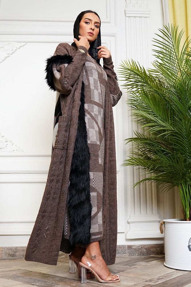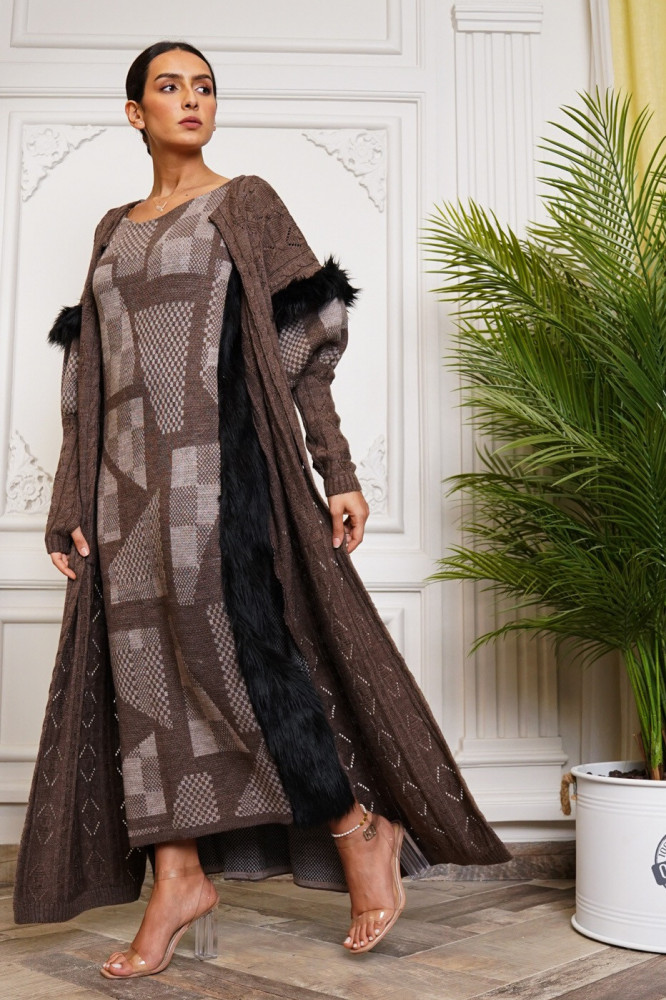 ( عباية بني فاتح مع فستان شتوية أكمام طويلة و بياقه دائرية وجيوب مع الطرحة مثالية لأوقات الشتاء الباردة✨)