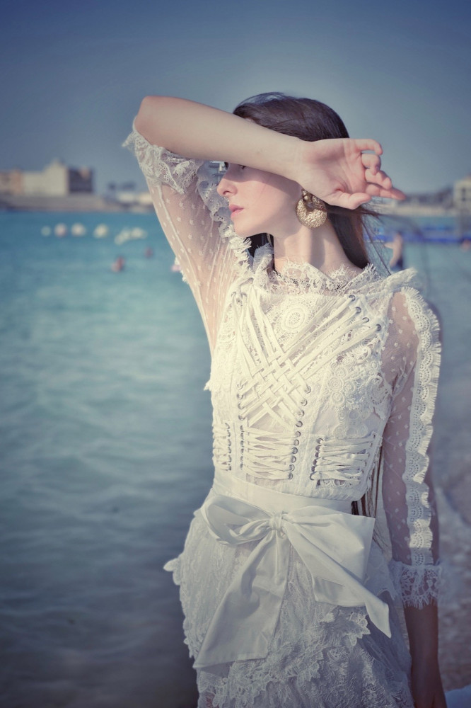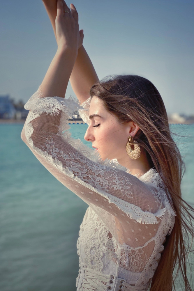 Long sleeve dress in a lace and dotted tulle fabric, short from the front and long from the back, detailed with silver rings at the front.