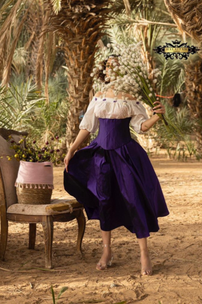 (فستان كاجوال مكون من قطعتين بلوزة و فستان باللونين الابيض والبنفسجي الزاهي يضفي على طلتك النهارية المزيد من التألق✨)