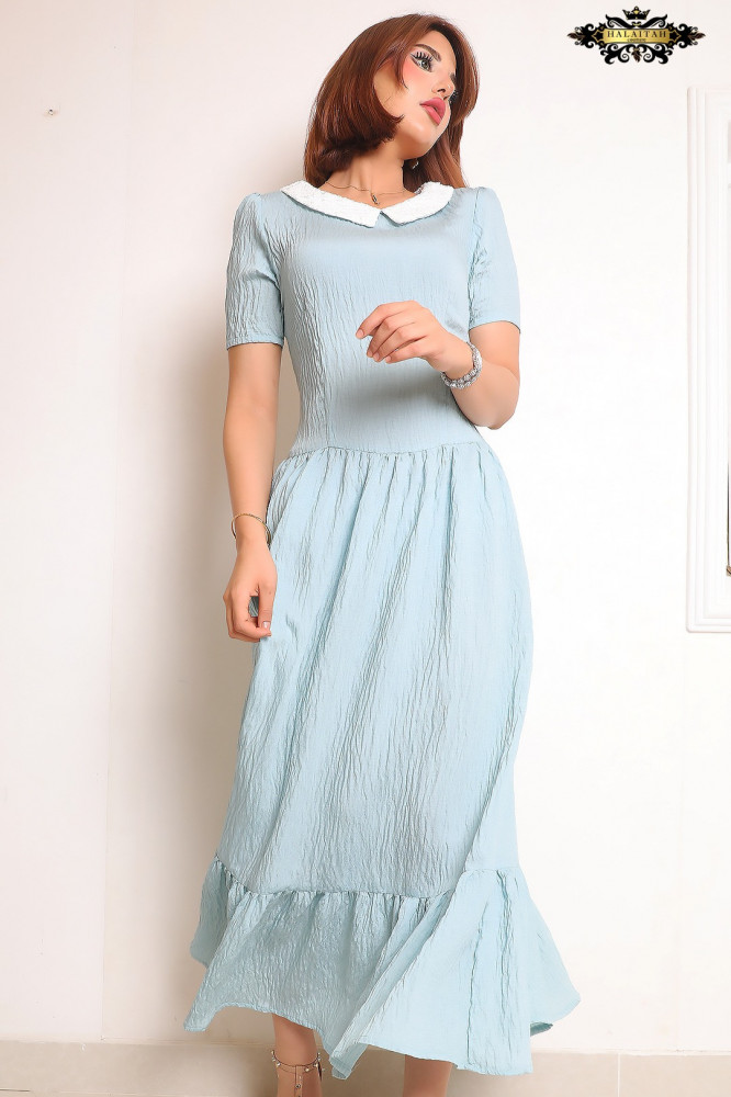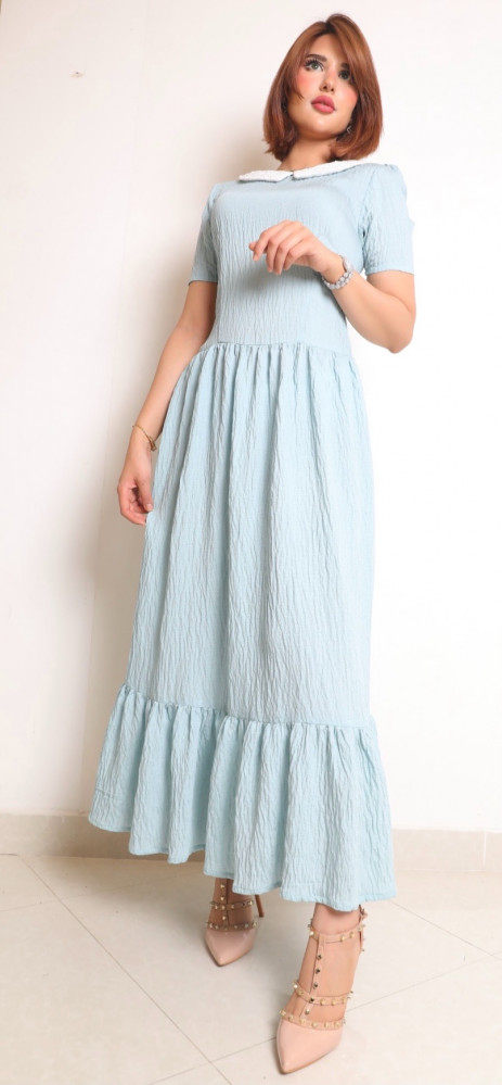 ( فستان بقماش صيفي ناعم بلون السماوي مصمم بياقه بيضاء دائرية انيقه، ومن الأسفل منتهي بكسرات خفيفه ✨)