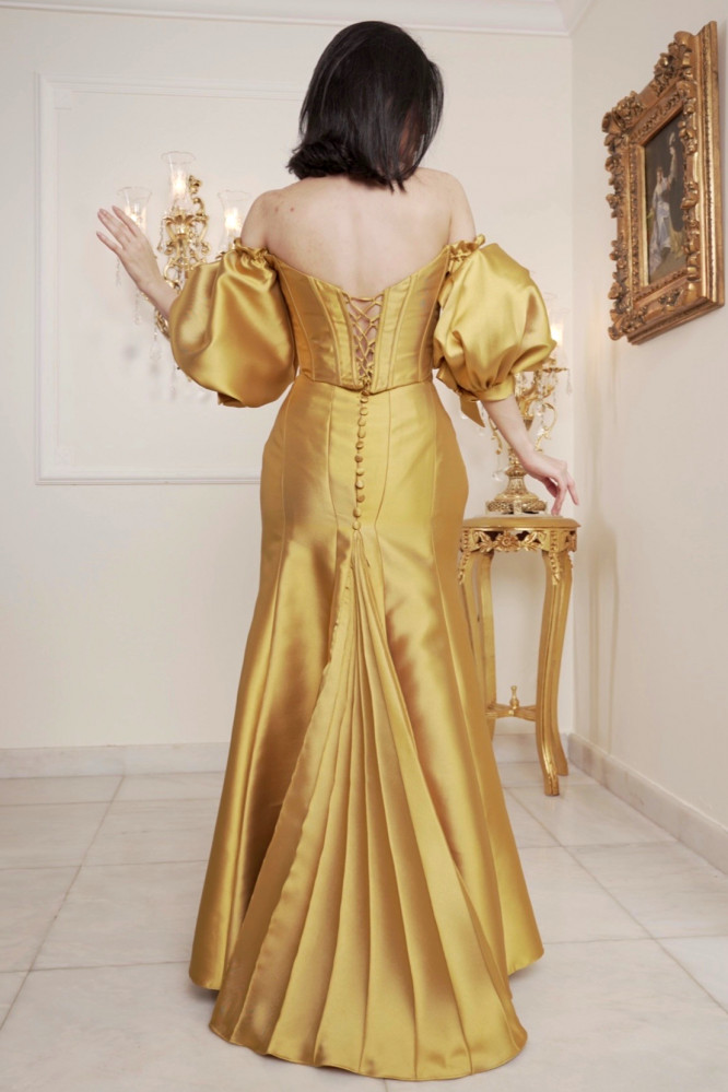 - مكون من قطعتين: كورسيت بخطوط طولية و تنورة بأزارير من الخلف