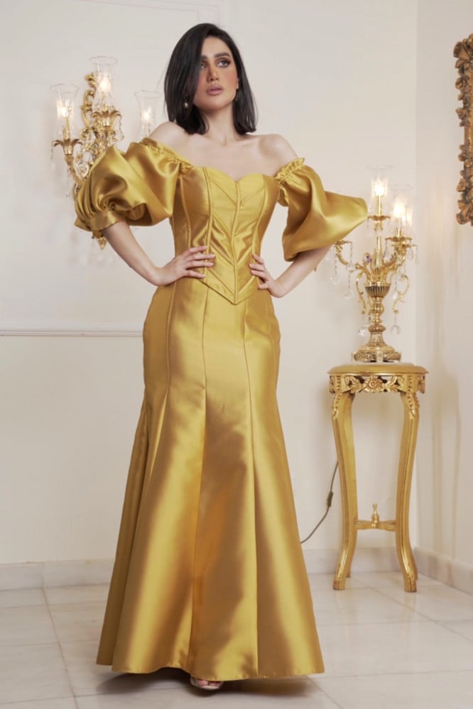 ( فستان فاخر كورسيت مزين بخطوط طولية مع تنورة راقية مزينة بأزارير من الخلف، تفاصيل التصميم تجعلك سيدة الحفل ✨)