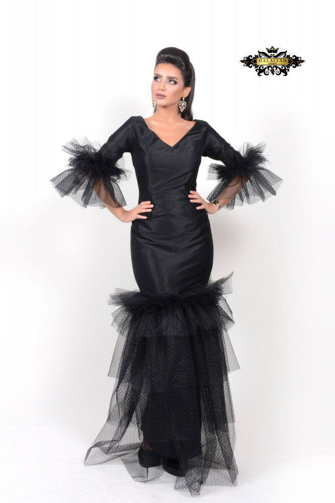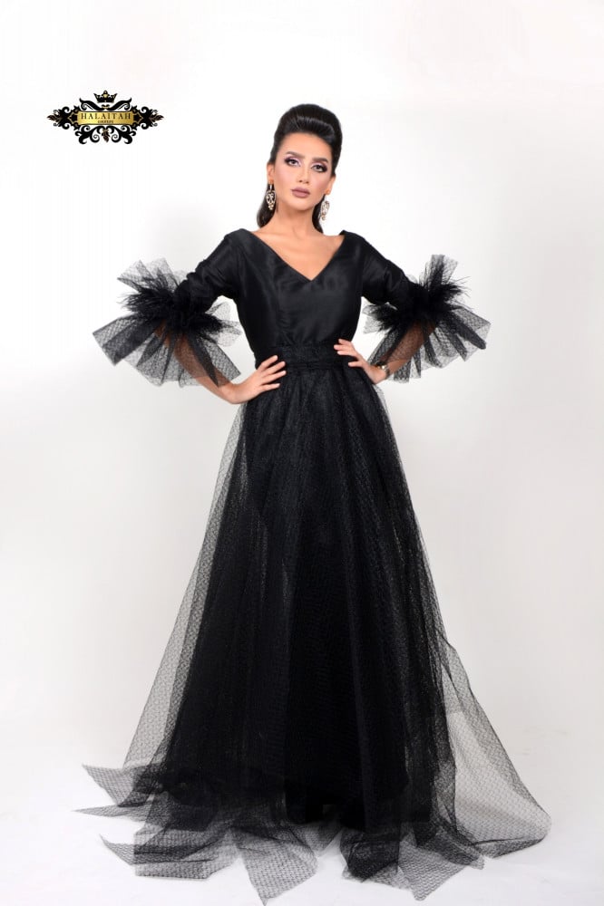 (فستان أسود بفتحة عنق فاتنه، الأكمام منتهيه بقماش تُل بارز أضاف لمسة أخاذه للفستان ✨)