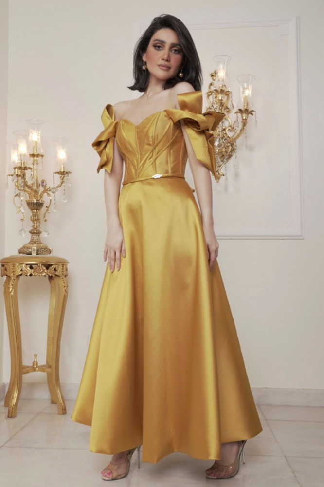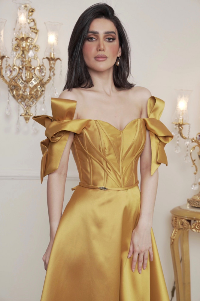 ( فستان فاخر كورسيت مزين بعقدة فيونكة من الاكتاف، تفاصيل التصميم تجعلك سيدة الحفل ✨)