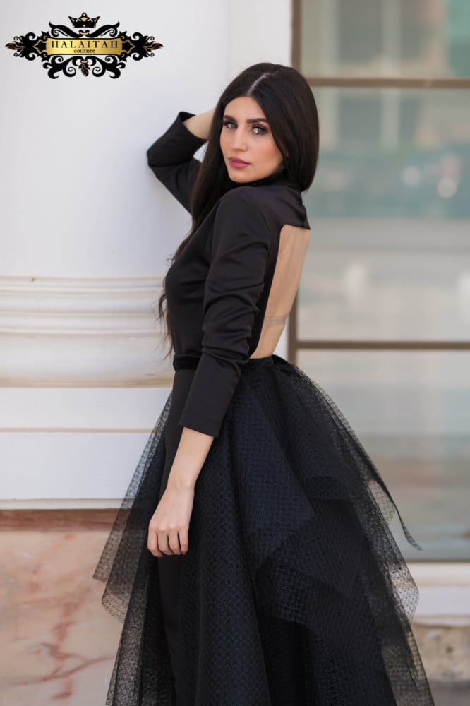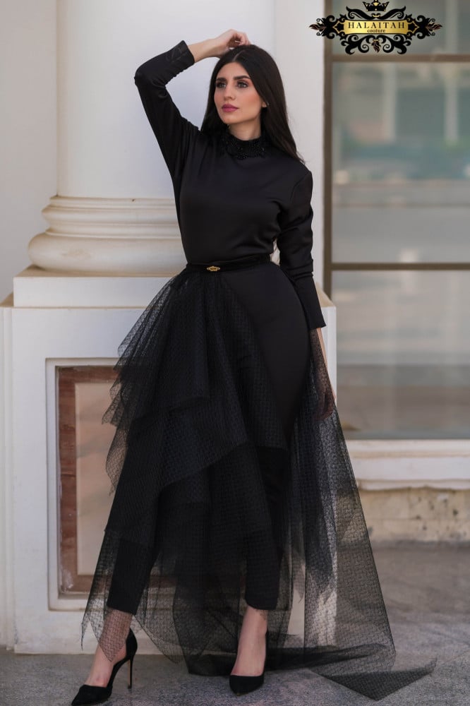 ( جمبسوت بقماش سكوبا مزين بتاق المصممه في المنتصف، يحتوي على تُل من الخصر بتدرجات متفاوته وفتحة ظهر عريضه وفاتنه ✨)
